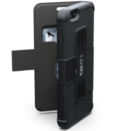 Protect your iPhone 6 Plus/6s Plus with a UAG Folio Case. This case is made from lightweight composite material with a water-resistant FrogSkin grip. A convenient slot holds up to three credit cards at hand. Its folio cover folds over the front of your device to protect its screen, and the chassis meets MIL STD 810G 516.6 military drop-test standards. For added protection, the Folio has scratch-resistant skid pads on the rear of the case and surrounding your device's screen.